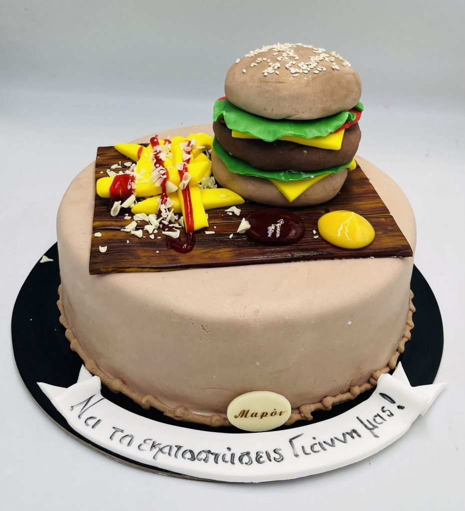 Για τους λάτρεις του fast food και των ξεχωριστών γεύσεων, αυτή η τούρτα είναι η απόλυτη επιλογή! Ένα ρεαλιστικό burger με συνοδεία πατάτες σε ξύλινη βάση, φτιαγμένο εξ ολοκλήρου από γλυκά υλικά. Ιδανική για όσους αγαπούν το junk food… και τις εκπλήξεις!