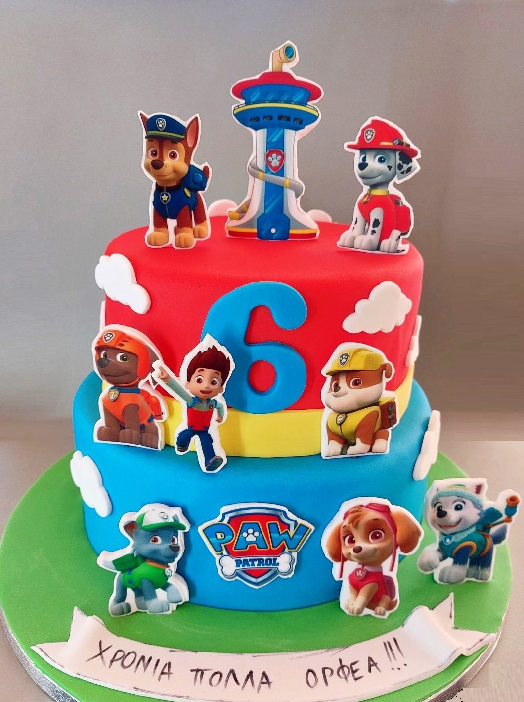 Εντυπωσιακή παιδική τούρτα γενεθλίων με θέμα το αγαπημένο παιδικό Paw Patrol! Διακοσμημένη με όλους τους αγαπημένους χαρακτήρες της σειράς, αυτή η τούρτα είναι η τέλεια επιλογή για τους μικρούς μας φίλους που λατρεύουν τις περιπέτειες της ομάδας διάσωσης. Μπορεί να προσαρμοστεί σε διάφορες γεύσεις και μεγέθη, ώστε να ταιριάζει απόλυτα στις προτιμήσεις σας.